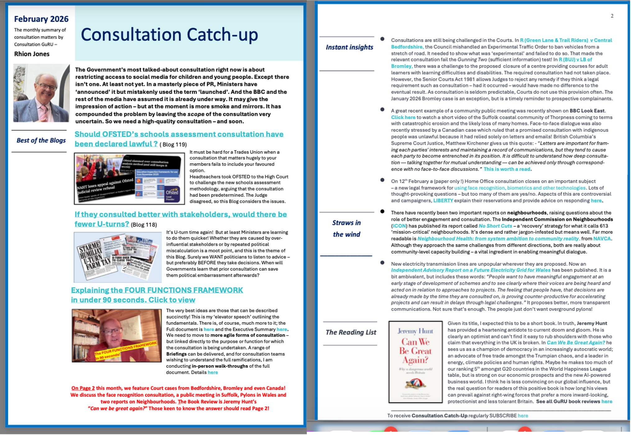 Should the OfSTED consultation on schools assessment have been ruled lawful? Should LB Bromley have got away with closing a site delivering adult learning courses without consulting the users? Central Bedfordshire, however, may accept they didn’t consult well enough on an Experimental Traffic Order. Over in Canada, a Judge has condemned a consultation confined only to letters and emails. Back home, we have a consultation that’s about to finish (Face recognition) and one that should have started …but hasn’t (Social media restrictions for young people). An inconclusive Report on Pylons in Wales, and two more papers on Neighbourhoods in England. But fear not, all is not lost as my book review is of Jeremy Hunt’s latest burst of optimism called “Can Britain Be Great Again?” All this in two accessible pages; a must-read when the news elsewhere is so much worse!